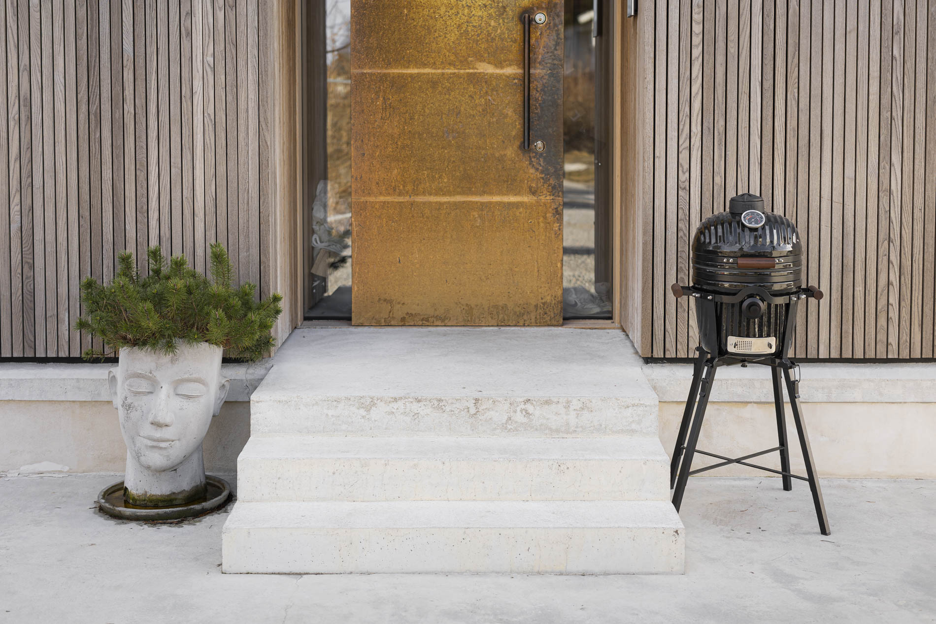 The handles are crafted from dark teak, providing a warm, elegant contrast to the grill’s clean design. The wood has been carefully selected to withstand outdoor conditions and retain its character over time. The rounded handles offer a secure and comfortable grip and represent a thoughtful combination of function and material that enhances the overall grilling experience.