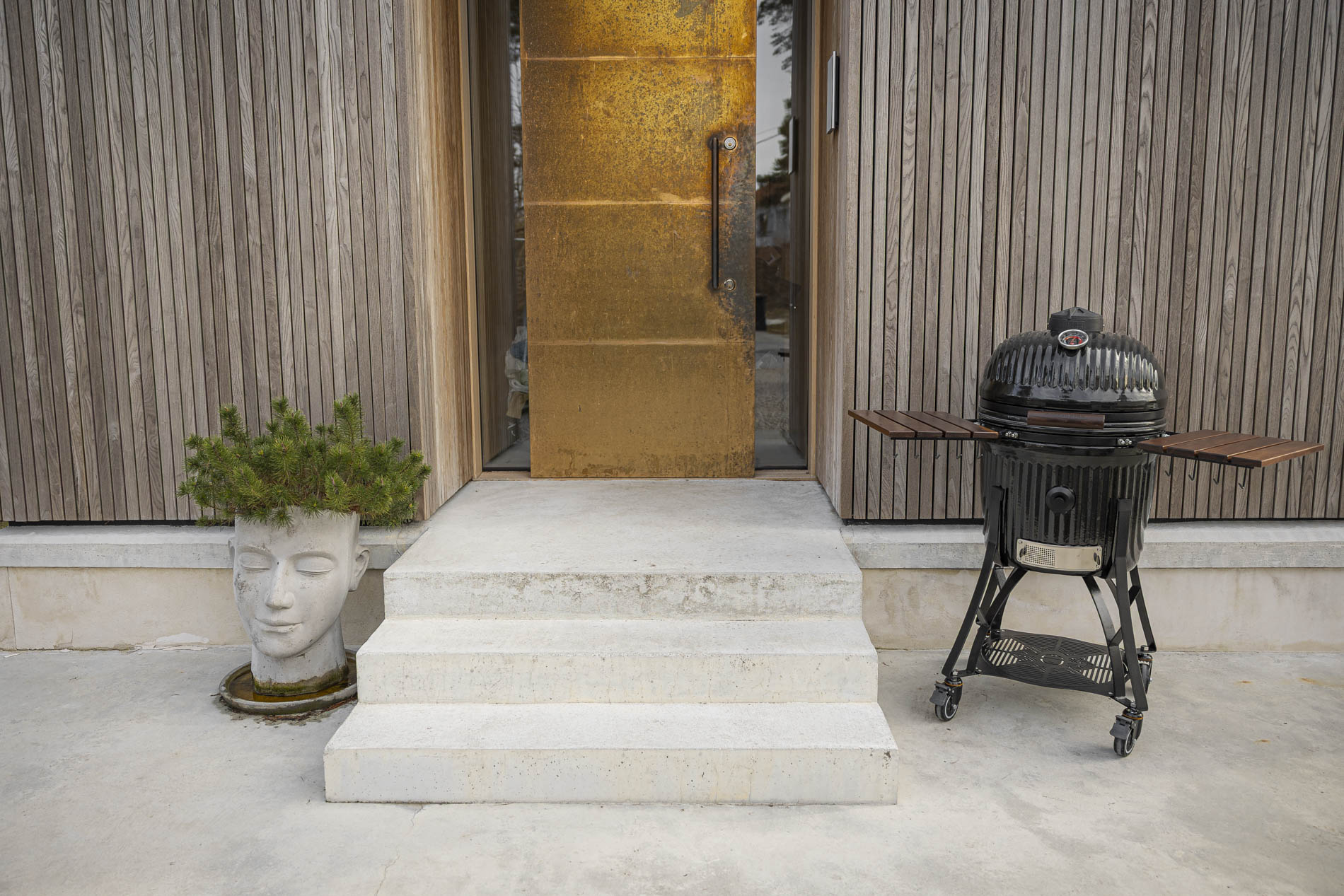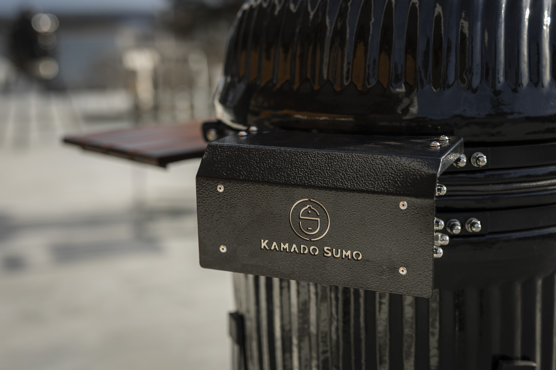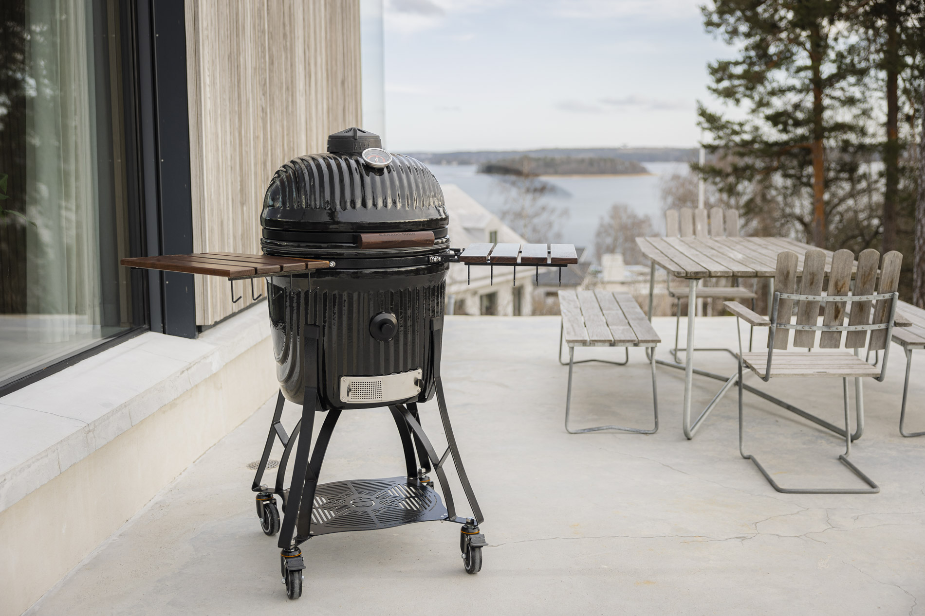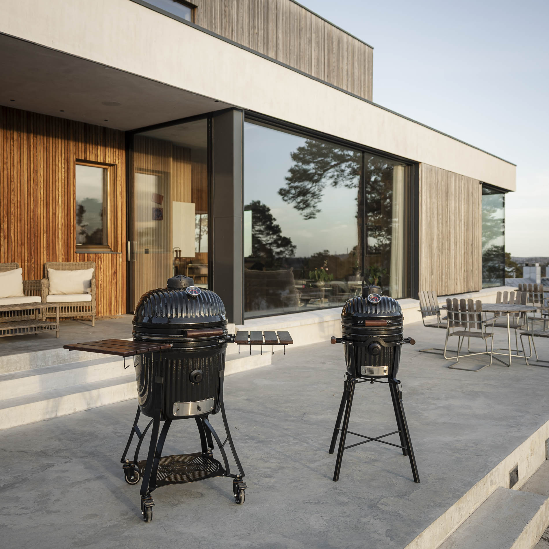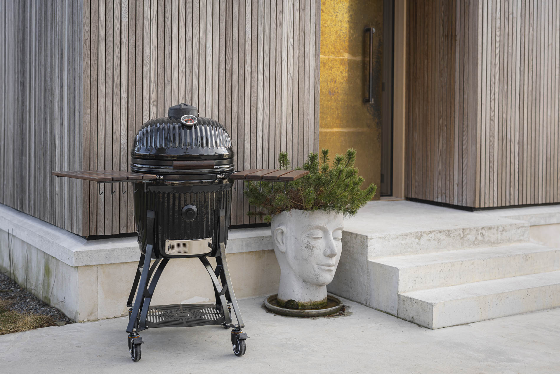 The side tables and handles are crafted from dark teak, providing a warm, elegant contrast to the grill’s clean design. The wood has been carefully selected to withstand outdoor conditions and retain its character over time. The side tables serve as sturdy work surfaces where you can easily prepare and serve food, while the handles provide a secure and comfortable grip. A well-thought-out combination of function and materials that enhances the overall experience at the grill.