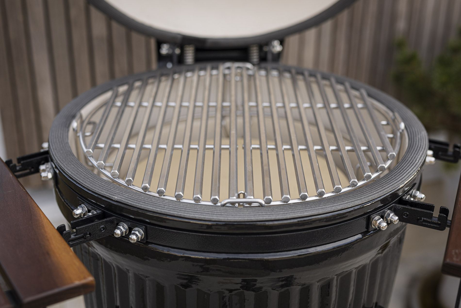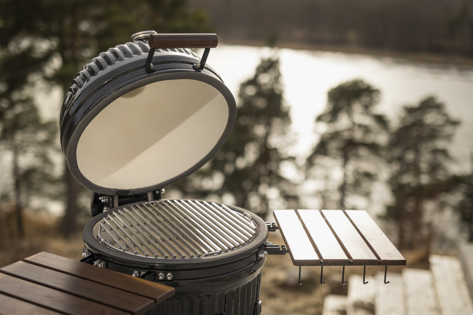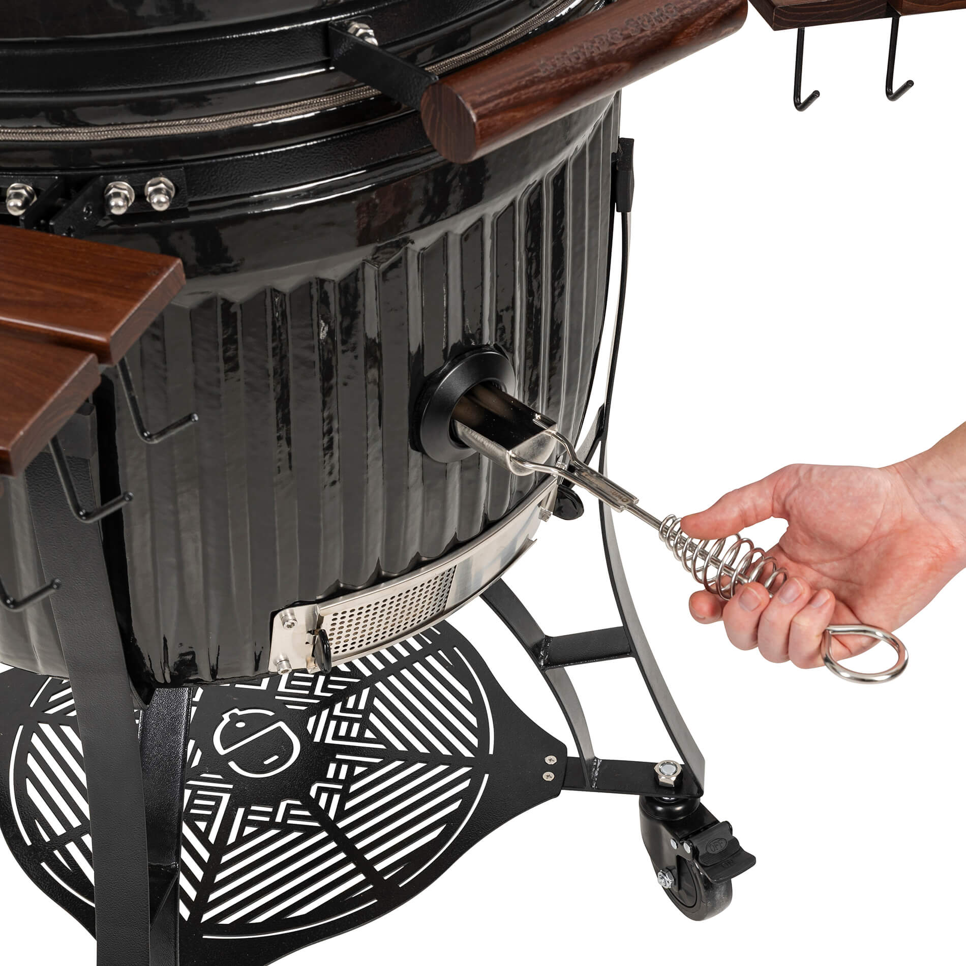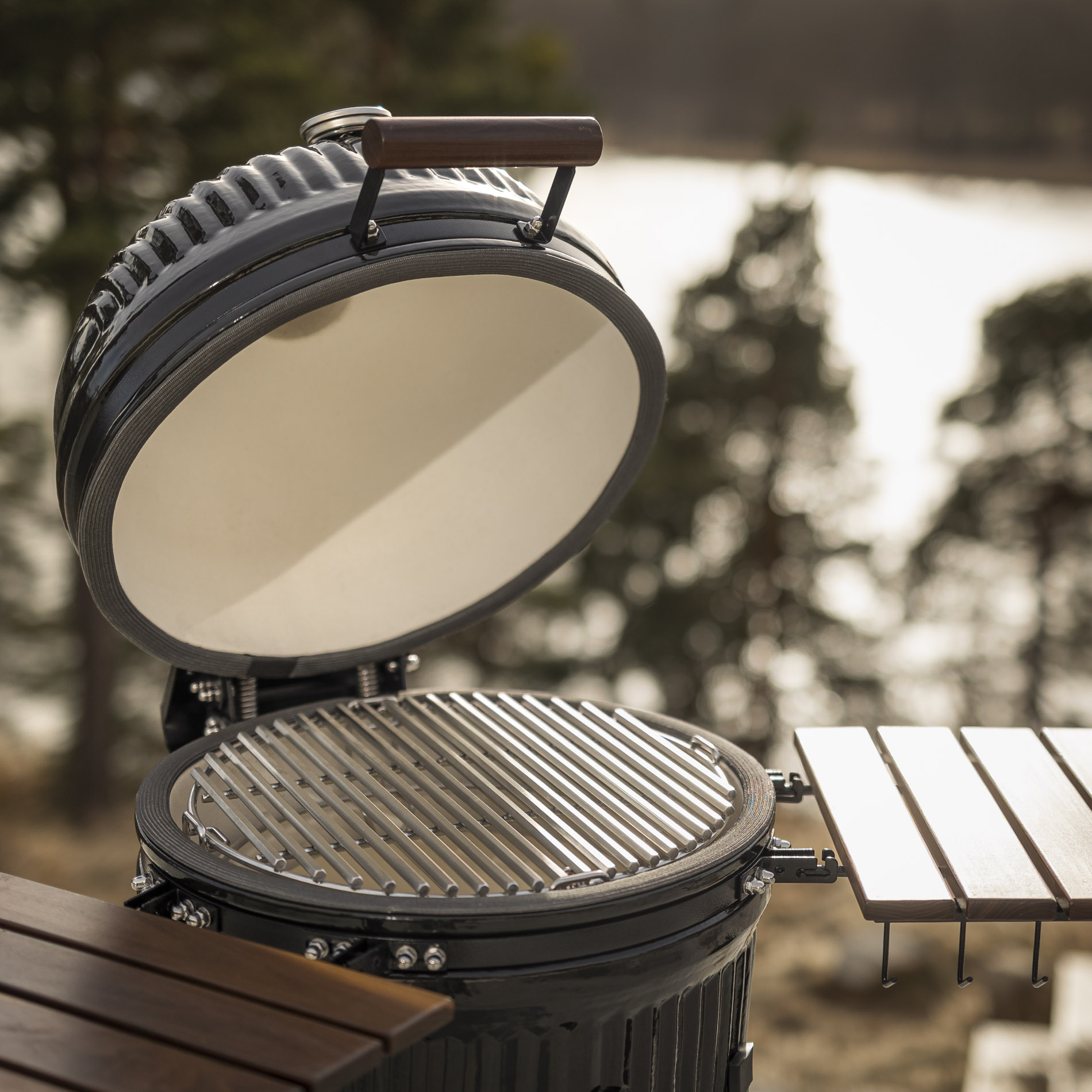 The solid ceramic lid on the Icon requires a design that matches its weight and precision. The sturdy hinges, featuring two strong springs, provide perfectly balanced opening and closing, making the lid easy to handle despite its weight. The design keeps the lid stable in all positions and ensures a tight seal throughout the cooking process. A robust and well-thought-out solution that combines function, durability, and a design language that blends seamlessly with the grill’s iconic aesthetic.