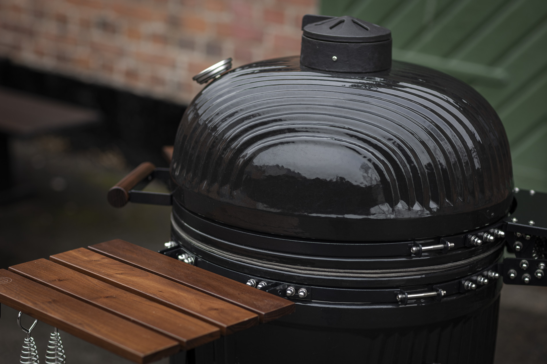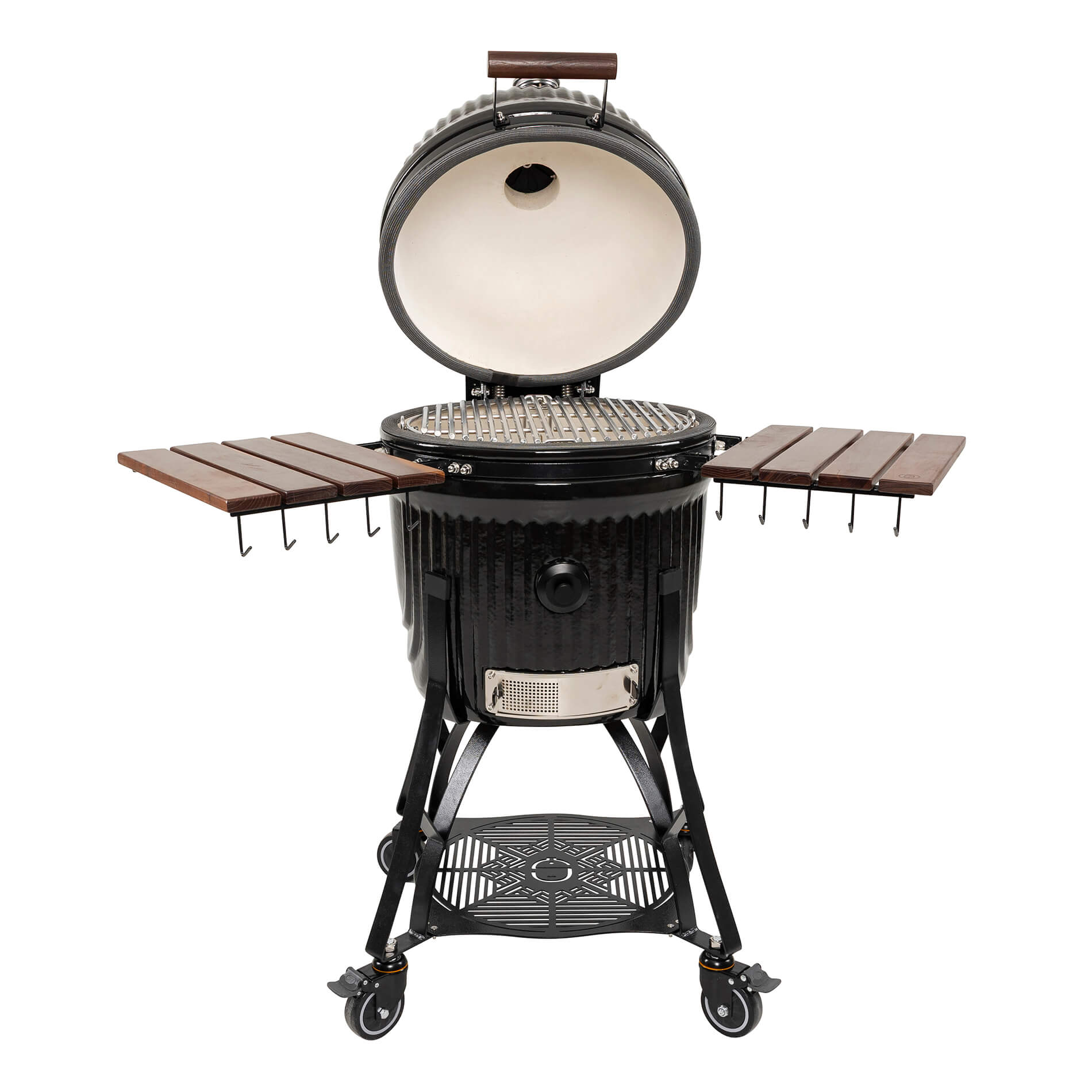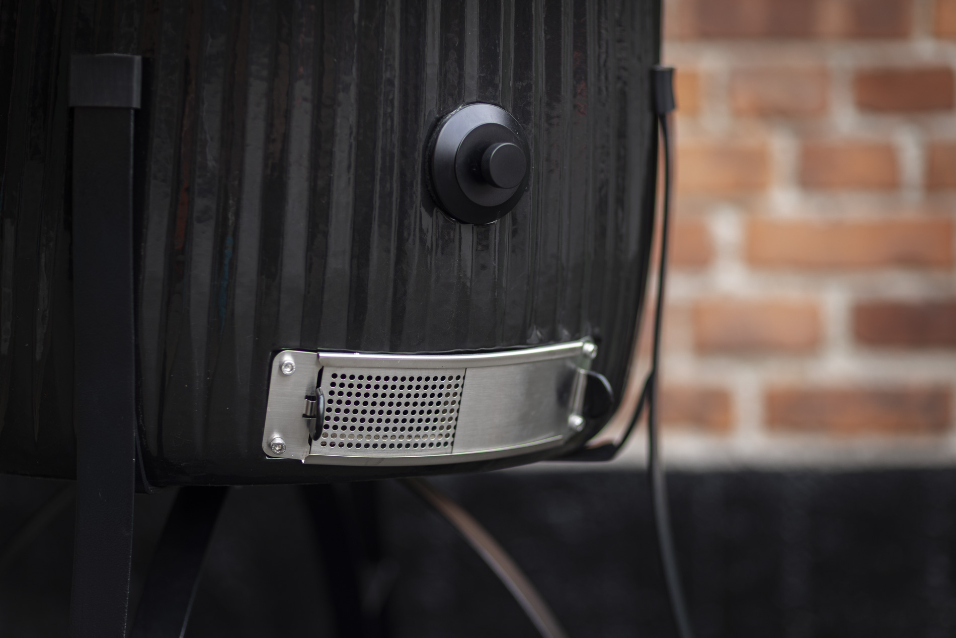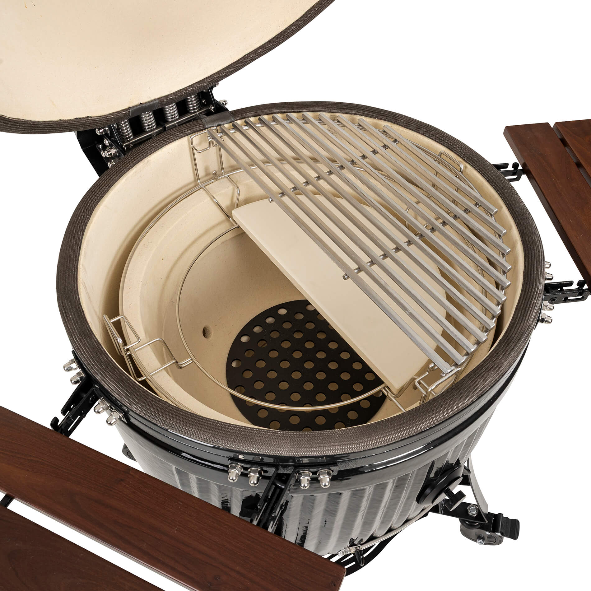 The solid ceramic lid on the Icon requires a design that matches its weight and precision. The sturdy hinges, featuring two strong springs, provide perfectly balanced opening and closing, making the lid easy to handle despite its weight. The design keeps the lid stable in all positions and ensures a tight seal throughout the cooking process. A robust and well-thought-out solution that combines function, durability, and a design language that blends seamlessly with the grill’s iconic aesthetic.