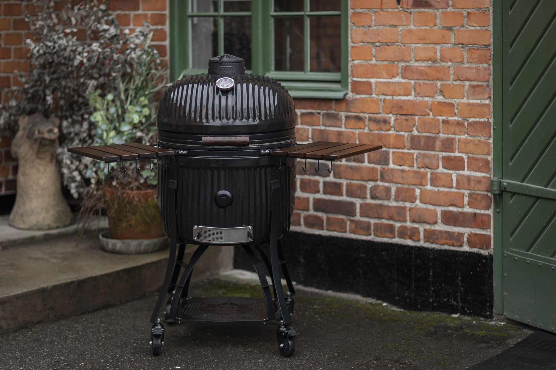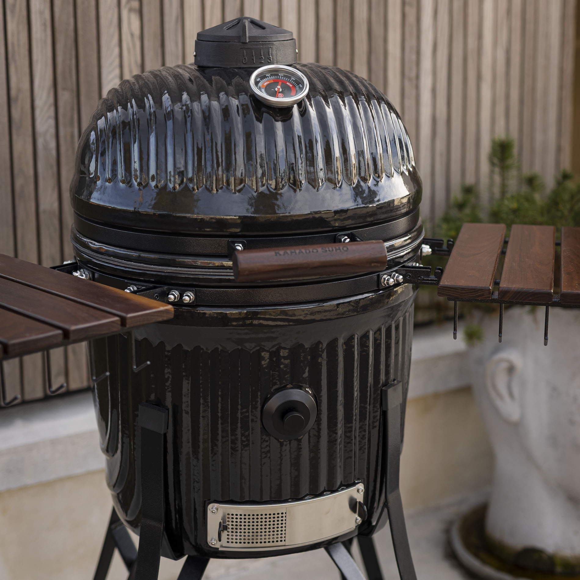 The extra-thick ceramic provides stable and even heat over time, perfect for everything from low & slow cooking to intense grilling over open coals. With a control door and integrated chip feeder, you can easily add smoke without losing temperature, while the top vent allows for precise control of airflow throughout the cooking process. The solid stainless steel grill grate delivers distinct grill marks and even heat across the entire surface. Combined with smart storage in the stylish stand kamado the Icon Large is a complete and versatile kamado perfect for grilling for family and friends.